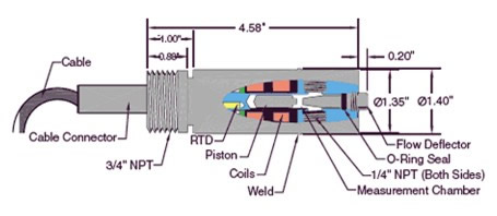 位于活塞上方的導流裝置,將液體導入測量室,活塞持續(xù)運動以不斷更新樣品,同時機械摩擦不斷擦洗測量室。 一個內(nèi)置的RTD溫度測量探頭,實時測量測量室的溫度。
